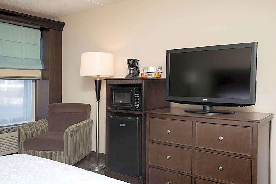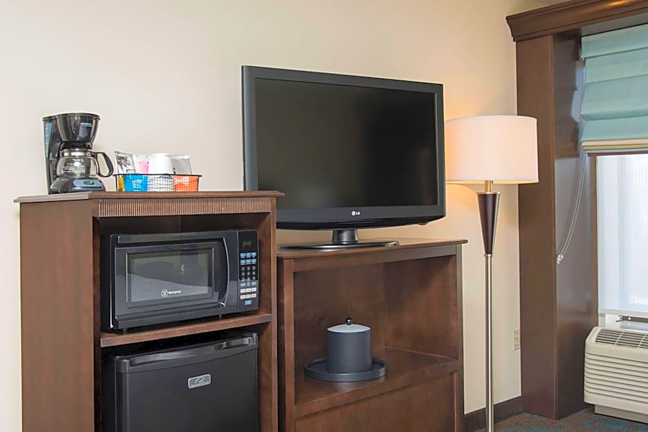 This hearing accessible room features a microwave and fridge.